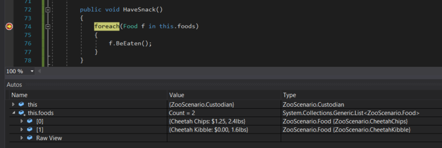 Now when HaveSnack is executed the method will skip over the CheetahKibble because it is not a type of IHumanFood. We've just saved the custodian from having a terrible day.