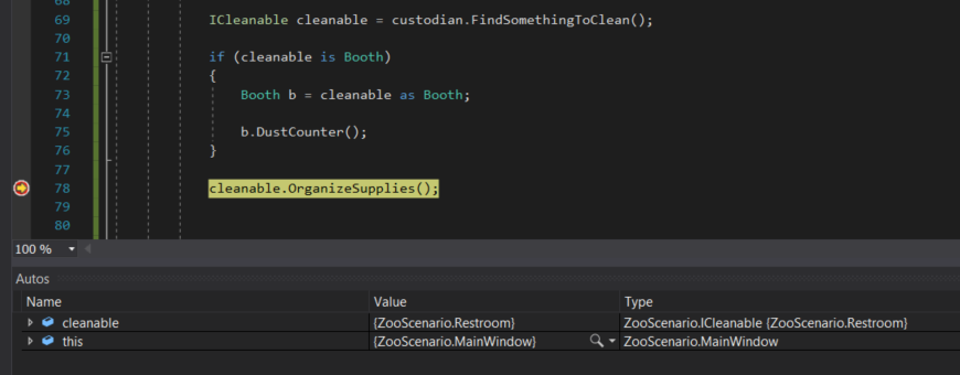 We also have an issue if we have an object that is an interface type and we need to do something related to a specific type. Let's take a look at a method the custodian has that returns the first ICleanable in their list.