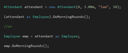 But what if we don't want the object to do stuff that an Attendant does? What if we only want it to do things an Employee does? We can cast the Attendant object as an Employee type and strip the object of its Attendant members. This makes the object change from a specific to a generic type.
