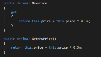 Note how the property and the method are nearly identical. Now we can use the NewPrice property to get the private calculation of the price field.