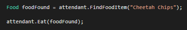 Instead what we can do is pass in the method call to FindFoodItem as the argument.