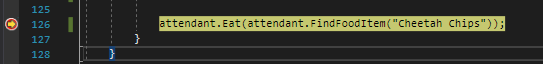 We can see this at work by running the application. When we press F11 on the Eat method, the debugger will first go into the FindFoodItem method so it can get use the return as an argument.