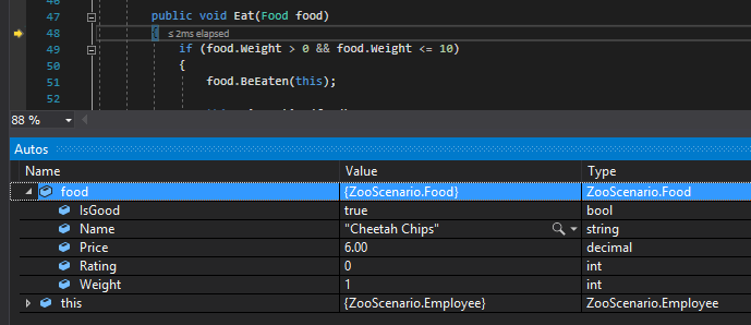 The snip below shows the state of the application after the FindFoodItem method has been executed and the debugger has returned to the Eat method call. You can see in the Autos window that a Food item has been returned.