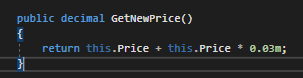 An example of this would be wanting to increase the price of an item of a Food item. In the Food class, we can define a method with a return of type decimal and return a 30% increase in the price of the Food item.