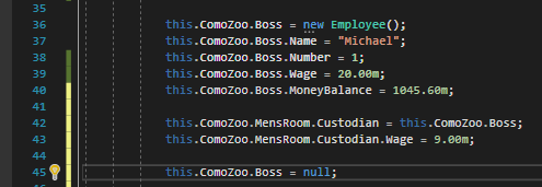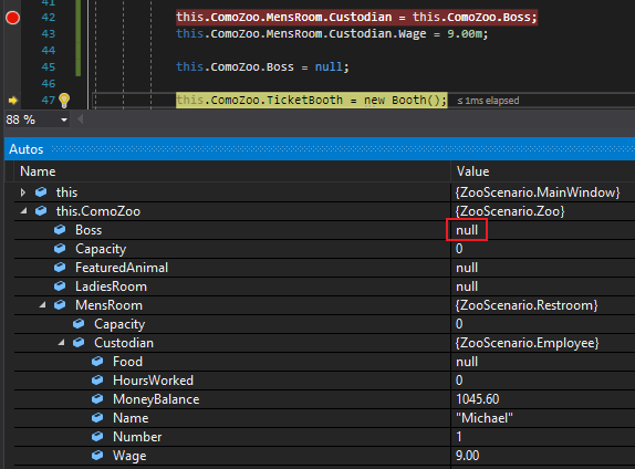 When line 45 executes, the Boss will be null, but the Custodian will still be an instance of Michael.