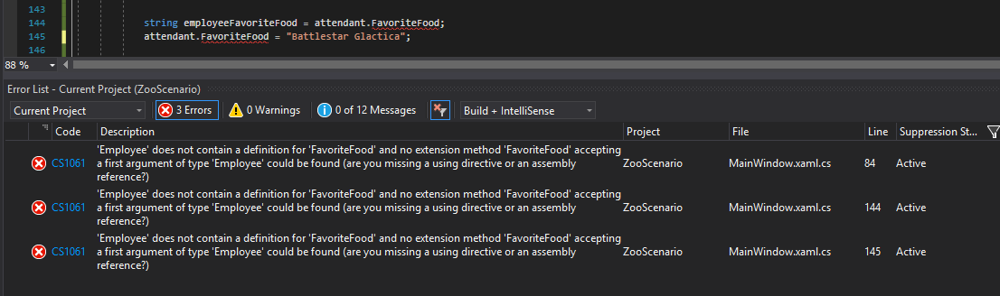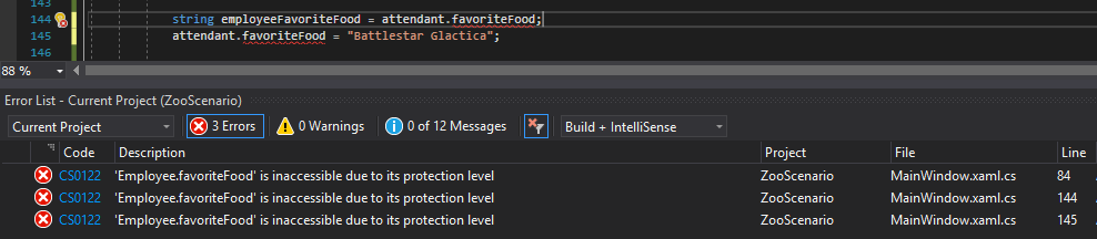 This is super invasive. Not only is "Battlestar Galactica" not a food, but the Employee should be the only one that gets to decide what their favorite food is. Additionally, the MainWindow shouldn't be able to know anything about the Employee's favorite food without their permission. So let's make the FavoriteFood field private.