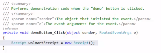 If you try to do anything with walmartReceipt in the demo2 button event handler, you will find that it doesn’t exist. The current method is outside of the scope of walmartReceipt, as walmartReceipt is ONLY inside of the original demo1 button event handler. The walmartReceipt variable would have to be changed to be a field for it to be able to be used in the demo2 button event handler because it is then at a class level.