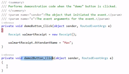 If the Demo 2 button was clicked on, it would create a new button click event handler in the MainWindow.cs.
