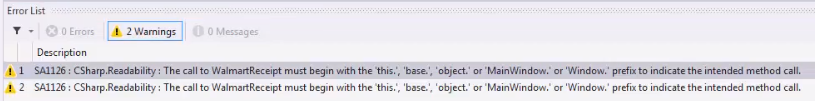 StyleCop wants the keyword “this” to be put in front of the call to WalmartReceipt. It is good programming practice (And StyleCop wishes this as well) that one should prefix field references with “this”. StyleCop will give you this warning until it is resolved, so that will give you good practice in doing such a thing.