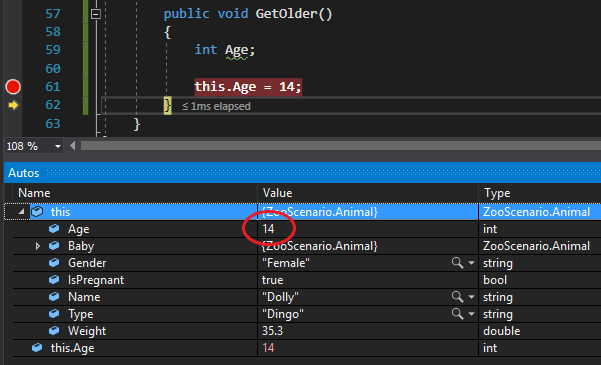 Notice how by adding this. to the beginning of Age now changes the 14 from being assigned to the variable to the 14 being assigned to the field (the 4 is now 14).