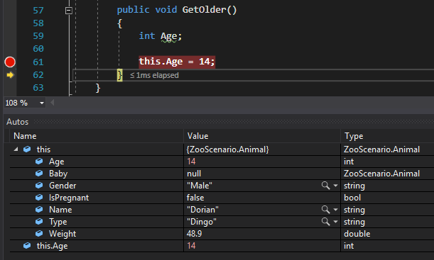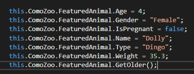 An important concept of 'this' is that it represents an instance. Notice how that in the examples above, the 'this' dropdown has Dolly the Dingo has the instance. That is because in previously written code the FeaturedAnimal field was instantiated and its fields assigned to and then that object (FeaturedAnimal) called the GetOlder method.