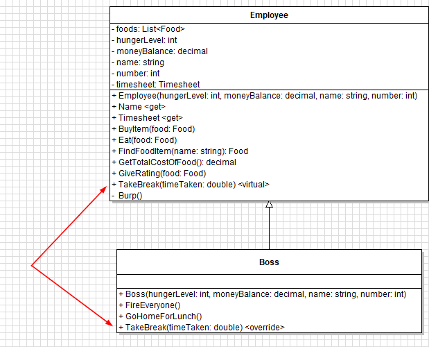 Looking at this diagram, we can see that both classes have a TakeBreak method, but the Employee class's is virtual and the Boss class's is override. This means that the Boss class can say "that's great that TakeBreak exists, but I don't like that that does and I want to do my own thing".