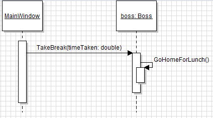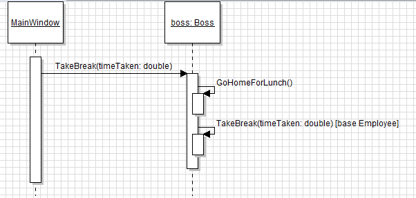 Note that the call looks exactly the same as the first call to TakeBreak, but is followed by a [base Employee] notation. This notation signifies the call is a call to base (the inherited class) and then shows the class type of the inherited class. Much like properties in sequence diagrams, we will have you create diagrams using [ ] notation, but instructions will show < > notation.