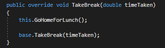 We have a problem, though, which is that the boss isn't taking their time out of their hours worked. They want to be a good leader and show they don't take free breaks so they need to call the TakeBreak method from the inherited class. To do this we need to use the base keyword. The keyword base is like this but for inherited classes (more on that later).