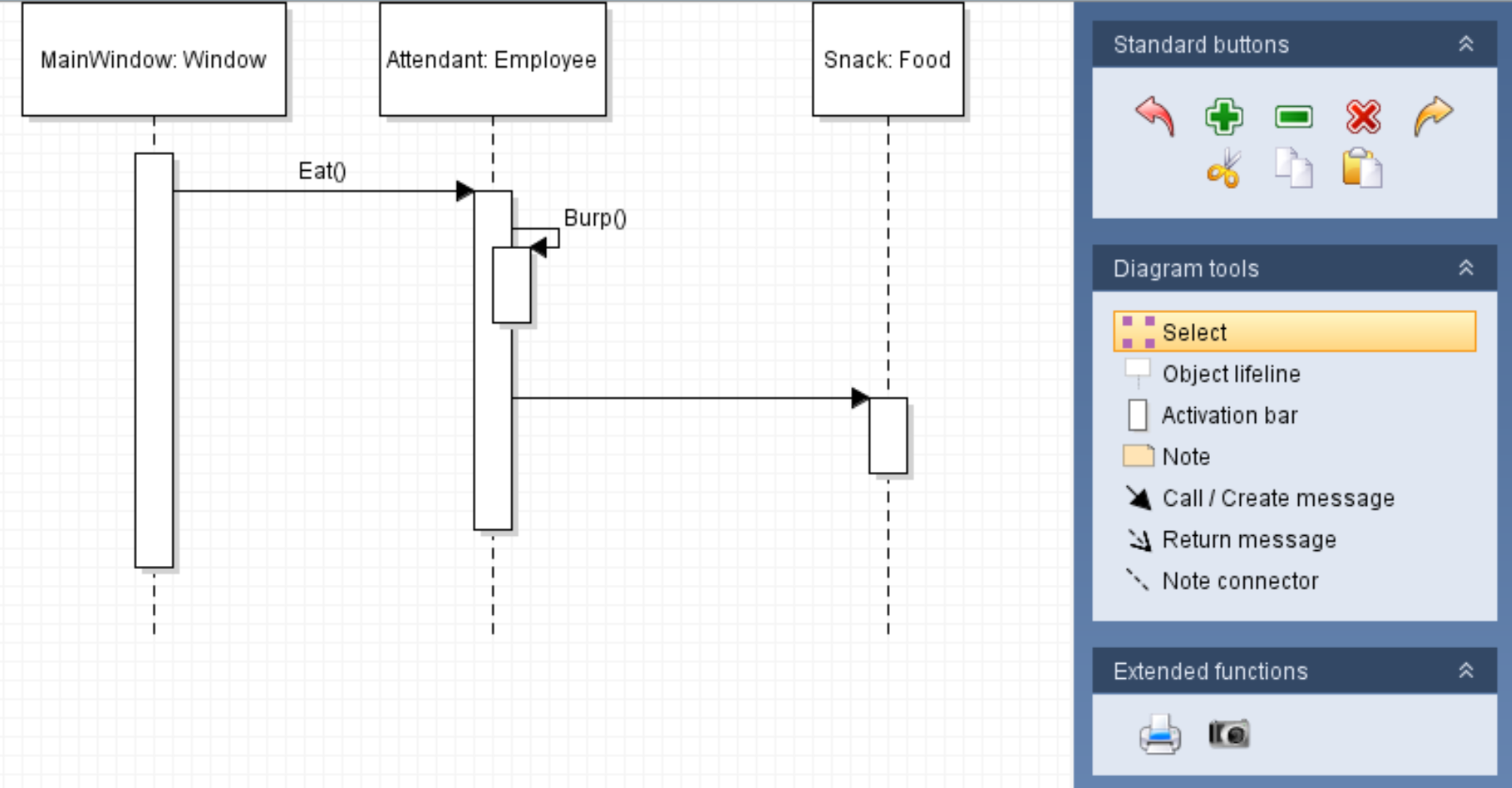 The diagram above can now be read as: "The Eat method is being called from the MainWindow on the Attendant object then the Burp method is being called from the Eat method and then the Melt method is called from the Eat method on the Snack object."