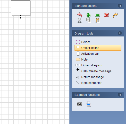 To begin creating a sequence diagram, the first thing you are going to do is create an 'object lifeline' node. To do this, select the 'Object lifeline' tool in the 'Diagram tools' toolbar and click into the workspace.