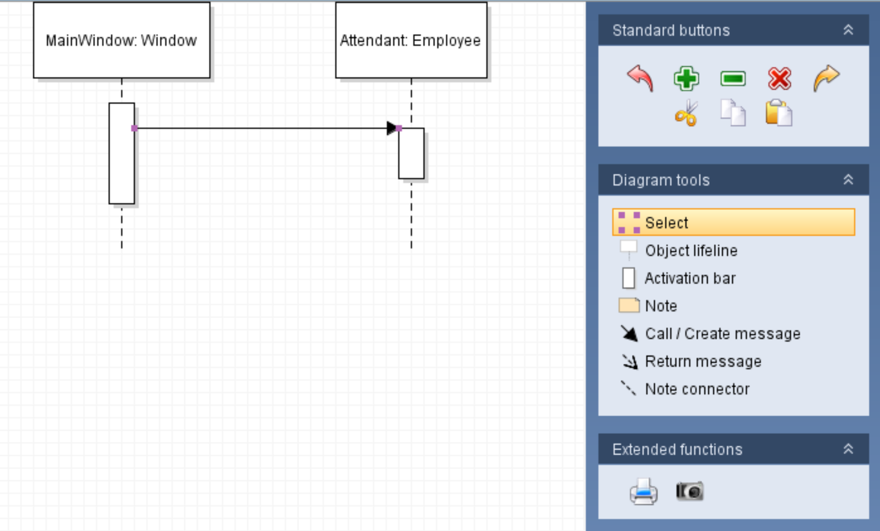 To create an activation bar, ensure the 'Activation bar' tool is highlighted and click the dotted line below the object lifeline node.