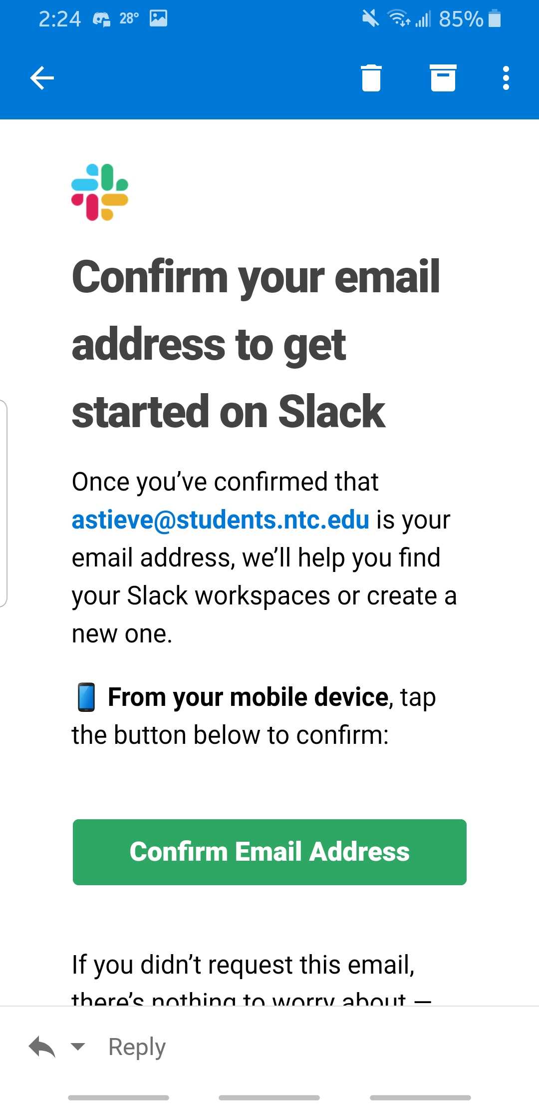 Tap "Confirm Email Address" and open with Slack.