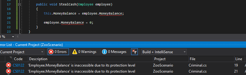 This is possible because the attendant's MoneyBalance field is public (i.e. available to anything that has access to it). We can fix this by making the MoneyBalance field private.