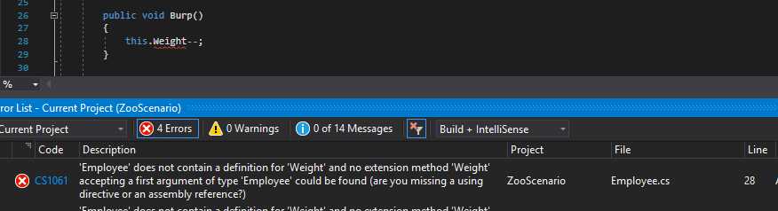 Note: When making fields private it is also necessary to change the first upper case letter to lower case.So now in the MainWindow where we are assigning the attendant's hoursWorked it is throwing an error because the MainWindow shouldn't be able to do anything to a field the Employee should handle themselves.